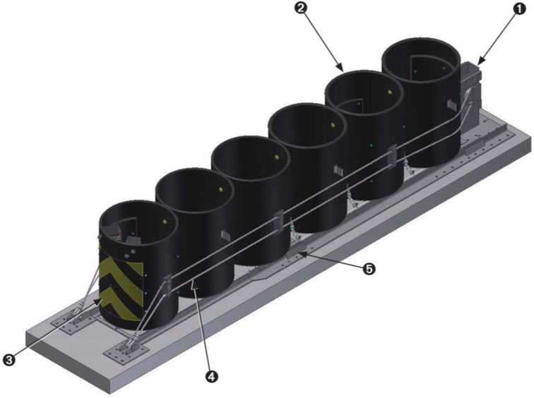 El amortiguador REACT 350®II es un sistema altamente eficiente y potencialmente resuable que utliliza 6 cilindros de polietileno de alta densidad (HMW/HDPE) posicionados sobre una base de acero. Se clasifica como un sistema no traspasable y que redirige al vehículo que lo impacta y cumple con el Nivel 3 del Reporte NCHRP 350.